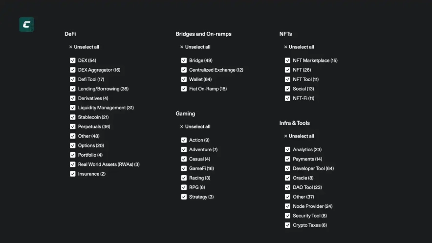 Екосистема Arbitrum являє собою об'єднання всіх проєктів і протоколів, що функціонують усередині цієї мережі. На сайті проєкту можна побачити список напрямків, у яких працює проєкт.
