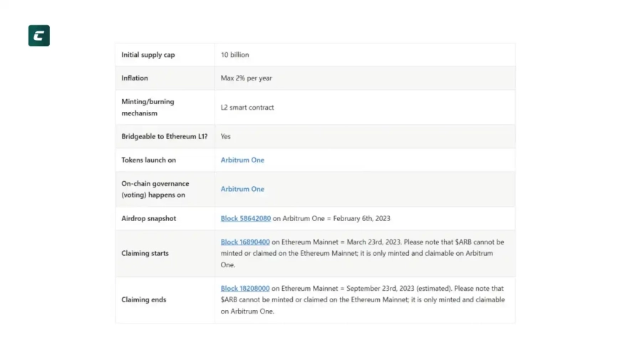 ARB - нативний токен екосистеми. Загальна кількість монет становить 10 мільярдів на поточний момент. У проєкті передбачена інфляційна модель. Також є і додаткова емісія, але вона обмежена 2% на рік. Що це означає? Протягом одного року до максимальної загальної кількості в 10 мільярдів монет може додатися всього лише 200 мільйонів ARB.
