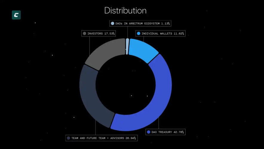 42,7% токенів дістанеться учасникам DAO. 26,94% монет призначені для команди і консультантів проєкту. Інвестори отримають 17,53% від загальної емісії. 11,62% емісії будуть повністю розподілені серед учасників тестування мережі Arbitrum. 1,13% від загального обсягу монет залишаться у розробників основної мережі.