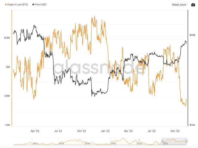 Наприклад, зараз, дивлячись на цю метрику, ми можемо зробити висновок про те, що кількість монет "у плюсі" перебуває на високому рівні - це несе потенціал утворення рівня опору. У жовтні 2023 року їх було значно менше. Коли ціна криптоактиву досягає рівня, де більшість інвесторів перебувають у збитках, можлива поява рівня підтримки. Це пов'язано з тим, що багато власників активів прагнуть докупити монети "за зниженою ціною". Індикатор Supply in Loss (Пропозиція у збитках) відображає загальну кількість монет, які були востаннє пересунуті за нижчою ціною порівняно з поточною.