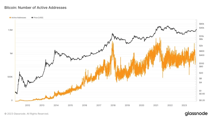Можна помітити, що, як правило, зі зростанням кількості активних адрес блокчейна BTC збільшувалася і вартість активу.
