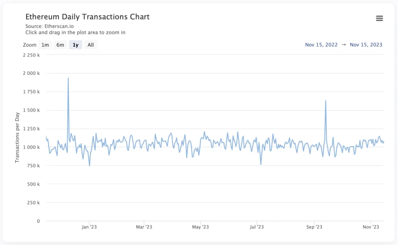 Однак важливо використовувати метрики в сукупності для того, щоб отримати більш чітке уявлення про стан ринку. Наприклад, разом із кількістю активних адрес у тій чи іншій мережі можна вивчити й обсяг транзакцій. Це дає змогу оцінити загальний рівень ончейн-активності та сформувати уявлення про динаміку попиту на операції з цим активом. Розглянемо той самий ETH у січні 2023 року. На чарті ми можемо побачити, що 01.01.2023 кількість транзакцій у мережі не перевищувала 750 000, однак починаючи з 04.01.2023 цифра перевищила 1 млн транзакцій.