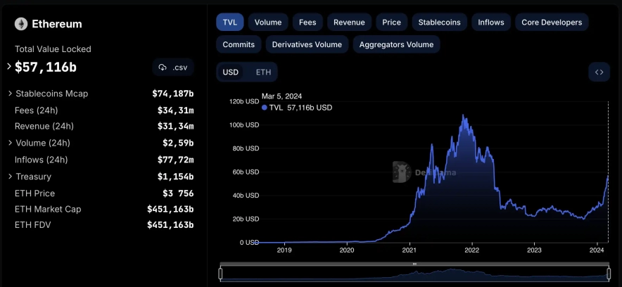 На даний момент, наприклад, ми можемо побачити, що TVL становить 57.116 млрд доларів. Звісно, порівняно з 2022 роком, коли ми могли побачити максимум за цим показником на значеннях 108 мільярдів доларів, це мало, проте на графіку ми можемо побачити, що він потихеньку починає відростати зараз - і це не дивно, оскільки ринок оживає.