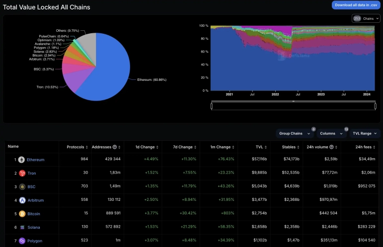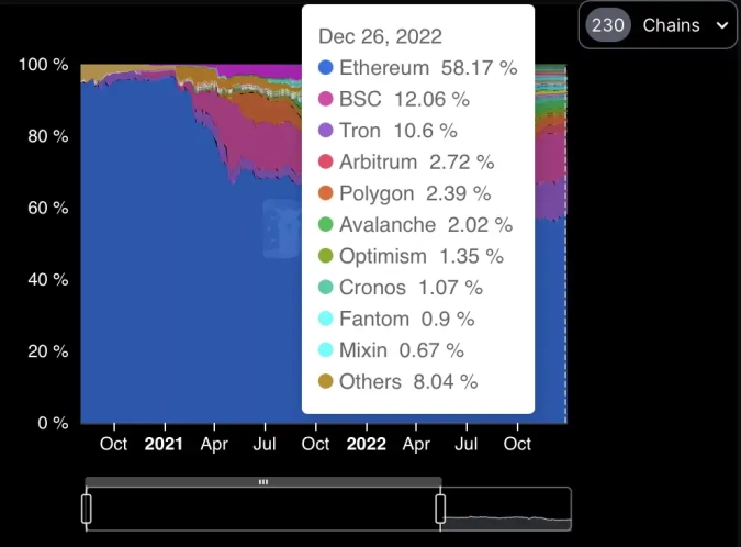 Цікаво відстежувати подібний показник на дистанції, адже так ми можемо дізнатися, активи якого ланцюга цікавлять учасників ринку в той чи інший момент. Наприклад, наприкінці 2022 року ми могли бачити, що на другому місці за TVL була мережа BSC (12.06%), а Tron була на 3-му місці. На сьогоднішній момент Tron вибив BSC з другого місця.