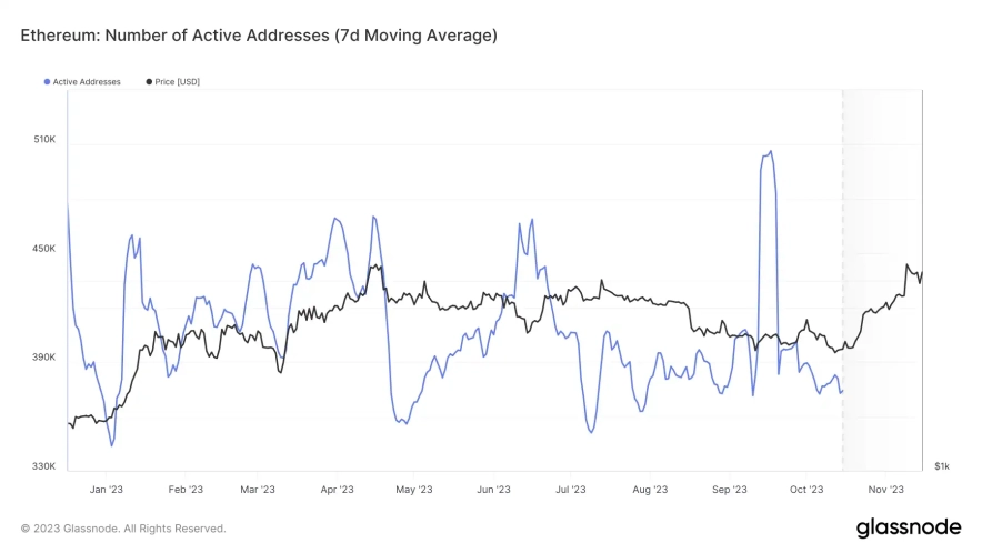 Так, наприклад, сталося в мережі Ethereum у першому місяці 2023 року: кількість активних адрес почала збільшуватися, і водночас піднялася вартість активу - з 1200$ (01.01.2023) до 1660$ (20.01.2023).