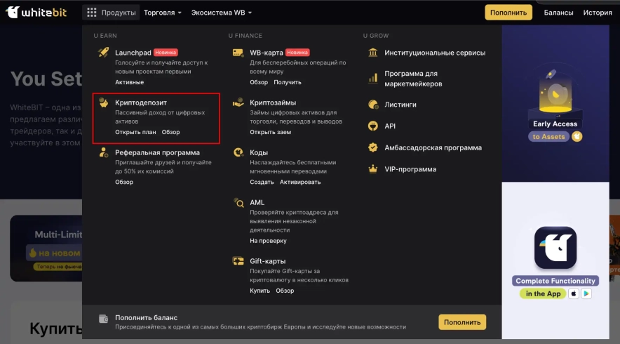 Для того, щоб внести монети в стейкінг на біржі WhiteBIT, вам слід перейти у вкладку "Продукти" і знайти там "Криптодепозит".
