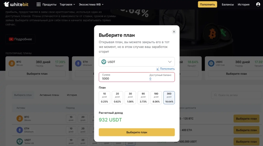 Дуже цікавою є можливість внести в стейкінг USDT Tether: якщо у вас є вільний стейблкоїн і ви не знаєте куди його інвестувати, щоб точно отримати ікси, то криптодепозит від WhiteBIT може бути чудовим рішенням: біржа пропонує 18.65% річних за ваш USDT. Залачуючи USDT, ви можете не переживати про те, що поки токени будуть у пулі, ціна на них зросте і ви не зможете їх продати, оскільки ціна USDT завжди дорівнює 1$. Вклавши 5000$ на рік, ви отримаєте безкоштовних 932$ після закінчення плану.