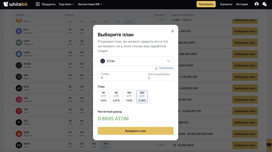 Як внести монети в стейкінг на прикладі біржі WhiteBIT