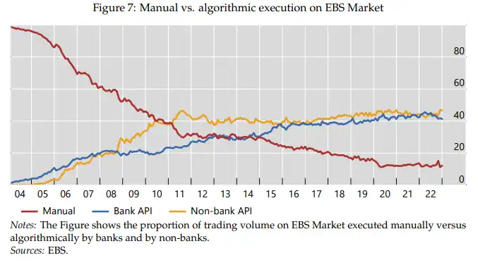 На малюнку 7 показано динаміку частки "ручної торгівлі" і "API-торгівлі" на платформі EBS Market з 2004 року, що ілюструє зростання алгоритмічної торгівлі на одній з основних CLOB. На початку вибірки на платформу були допущені тільки банки, і вся торгівля велася вручну шляхом уведення торгових інструкцій на спеціалізованій клавіатурі терміналу EBS. Після того як EBS дозволила прямий інтерфейс комп'ютерів зі своєю платформою, банки почали торгувати алгоритмічно 2004 року (банківський API). Небанки почали у 2005 році (небанківський API), коли вони вперше були допущені на платформу EBS через угоди PB.