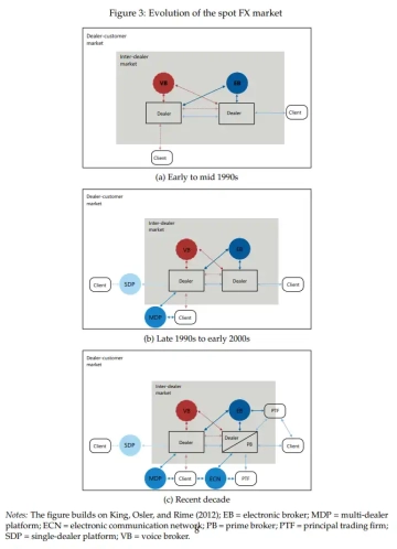 На рисунку 3 зроблено спробу відобразити еволюцію структури валютного ринку за останні три десятиліття. На верхній панелі рисунка 3a показано стилізовану картину структури ринку на початку-середині 1990-х років, на рисунку 3b - на початку-середині 2000-х років, а на рисунку 3c - в останнє десятиліття. Заштрихована область позначає міждилерський ринок, а навколишня область - сегмент ринку "дилер - клієнт". Червоні стрілки вказують на голосове виконання, а сині - на електронне виконання.