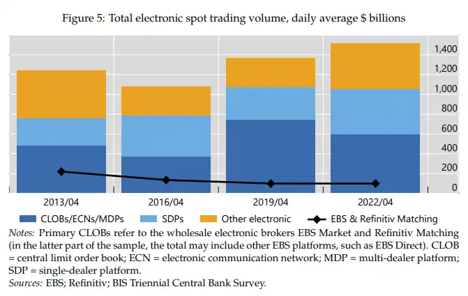 Примітки: Первинні CLOB відносяться до оптових електронних брокерів EBS Market і Refinitiv Matching (в останній частині вибірки в загальну суму можуть бути включені інші платформи EBS, такі як EBS Direct). CLOB = центральна книга лімітних ордерів; ECN = електронна комунікаційна мережа; MDP = багатодилерська платформа; SDP = однодилерська платформа.