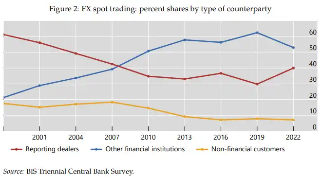 Потім дилери торгували між собою для хеджування своїх позицій і ребалансування своїх запасів, що забезпечувало значний обсяг торгів на валютному ринку. На рисунку 2 показано, що наприкінці 1990-х років на міждилерську торгівлю припадало близько двох третин усіх спот-торгів на валютному ринку.