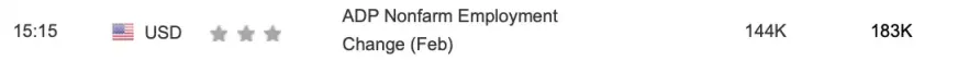 Доповідь від ADP відображає вимір змін числа робітників у приватному секторі США за лютий. Цей індикатор показує попередні дані щодо Nonfarm Payrolls, до якого особлива увага та який має високий вплив на фінансові ринки.