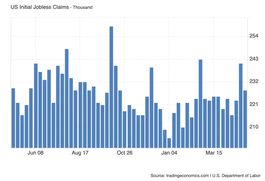 Щотижневий індикатор стану ринку праці. Показник залишається стабільним, і значення поблизу 230K відповідають поточному "здоровому" рівню зайнятості.