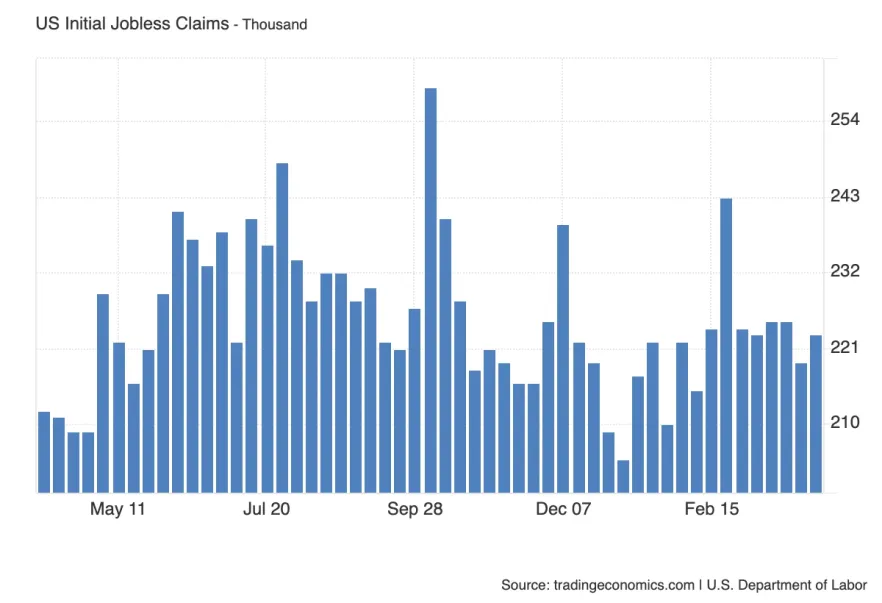 Щотижневий показник первинних заявок на допомогу з безробіття залишається відносно стабільним, не виходячи за рамки звичного діапазону. Значення, вищі за 230-240 тис., можуть привернути увагу як ознака ослаблення ринку праці, що починається, особливо на тлі зростання інфляційних ризиків і обговорення можливого уповільнення економіки.