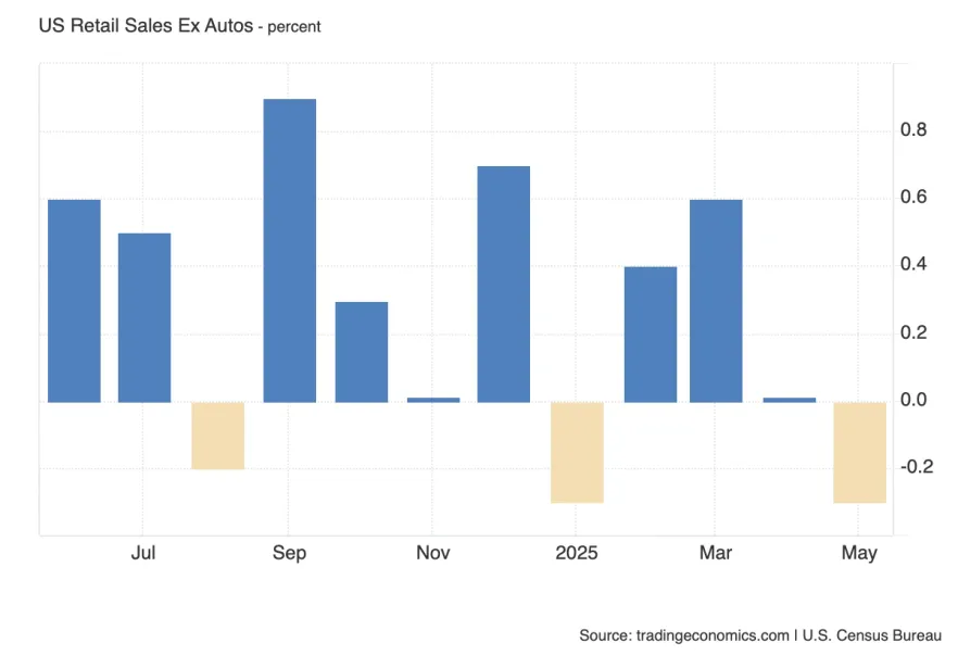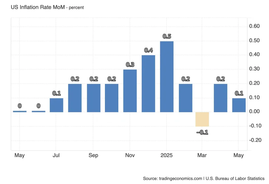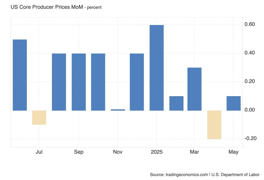 Очікується зростання до 0.3% після слабкого 0.1% у травні - це стане перевіркою заяв ФРС про тиск з боку мит. Ринки чекають підтвердження прискорення, і сюрприз донизу може викликати ослаблення долара і зростання облігацій, як це було минулого місяця.