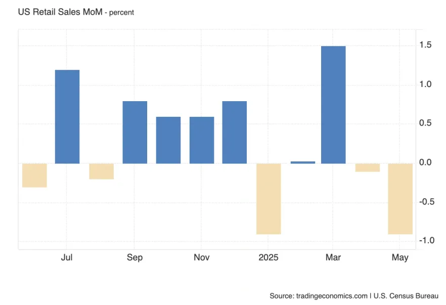 Раніше дані вказували на слабкий попит: роздрібні продажі в травні впали на 0.9%, що стало значною ознакою охолодження економіки. Додаткова підтримка цього сценарію - слабкість інших індексів (NFIB, ISM, S&P Global). Однак очікується відскік у червні - прогноз на +0.2%, що могло б говорити про відновлення споживчої активності. Якщо дані підтвердять зростання: це зміцнить тезу про неміцність недавнього спаду. Якщо ж підсумок знову буде негативним: знову заговоримо про уповільнення економіки США і ризик зниження ставок.