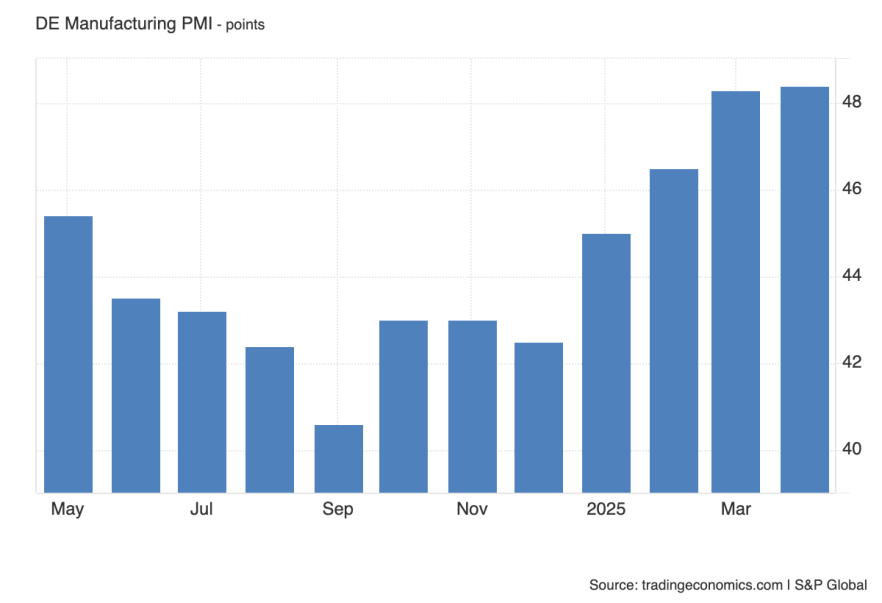 Промисловий сектор Німеччини залишається нижчим за поріг зростання (50) уже понад рік, але за останні півроку спостерігається стабільне поліпшення динаміки.