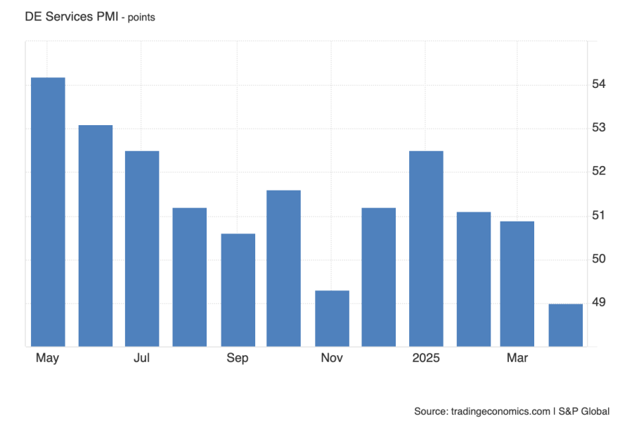 Послуги - ключовий сектор економіки Німеччини - нещодавно несподівано опустилися нижче нейтральної позначки 50, що є нетиповим явищем для сектора, який до цього стабільно утримувався в зоні зростання.
