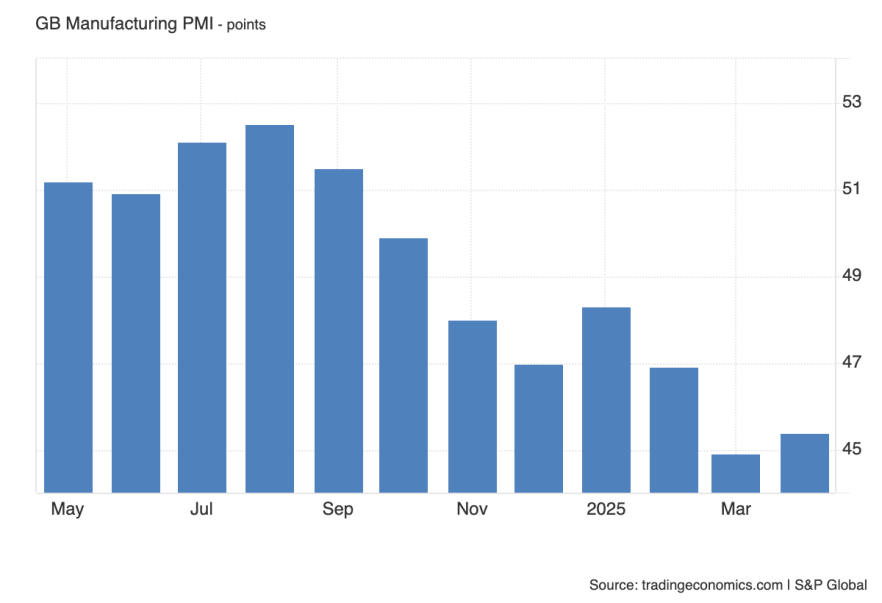 Хоча прогноз вказує на стабілізацію, значення залишаються нехарактерно низькими: ще рік тому PMI тримався в районі 55 і вище, відображаючи впевнене зростання. Такий зсув може свідчити про переоцінку попиту в економіці та потенційне охолодження споживчої активності.