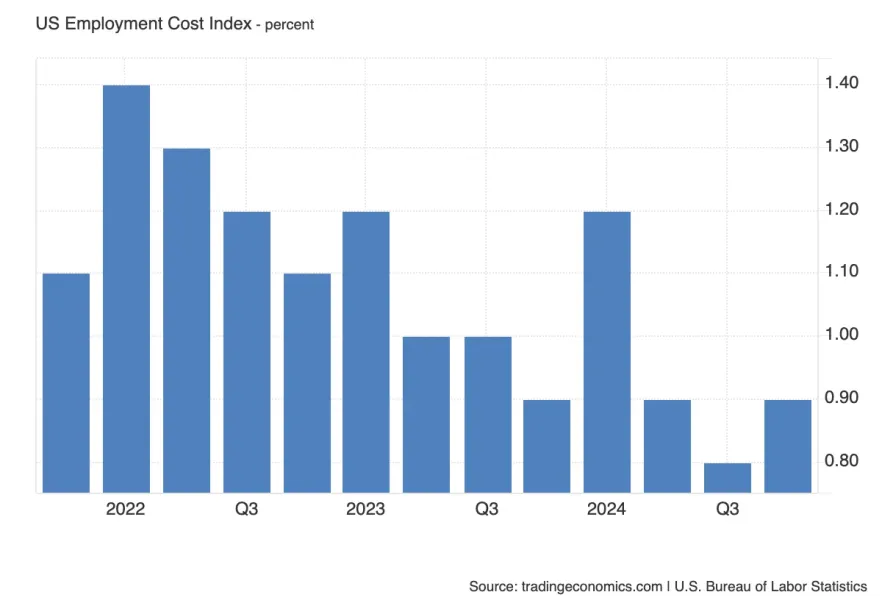 Employment Cost Index (ECI) - це квартальний показник зростання витрат на оплату праці в США. Він враховує заробітні плати та компенсаційні виплати. Показник важливий для розуміння тиску на інфляцію з боку ринку праці.