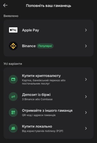 Додаток також підтримує пряму купівлю криптовалюти за фіатні гроші. Для цього потрібно відкрити розділ «Купити», вибрати токен, вказати суму в доларах або євро та вибрати платіжний метод – банківську картку або один із підтримуваних сервісів.