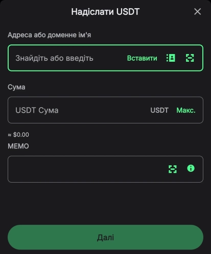Для відправки коштів необхідно відкрити програму, натиснути на кнопку “надіслати” та вибрати актив, який потрібно перекласти.