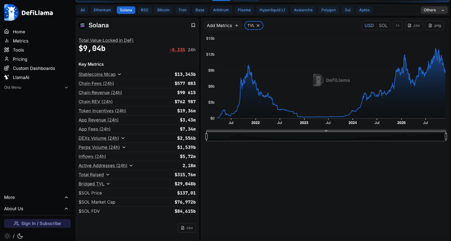 TVL блокчейну Solana на DeFi Llama
