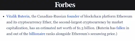 Віталік Бутерін відомий як один із засновників Ethereum, одного з найуспішніших криптопроєктів і другої за капіталізацією криптовалюти, і головне обличчя проєкту. 2021 року Віталік Бутерін досяг неймовірного успіху, ставши наймолодшим криптовалютним мільярдером у світі. Американський журнал Forbes оцінив його статки в 1,3 мільярда доларів і заніс його до списку найпомітніших нових мільярдерів.