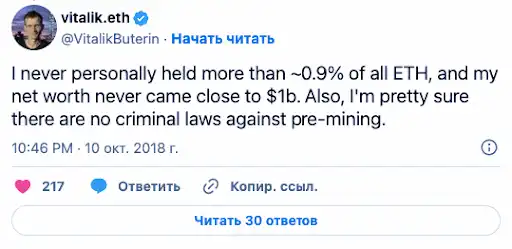 Також у 2018 Віталік публічно показав свій гаманець, а також підтвердив якою кількістю токенів Ethereum він володіє.