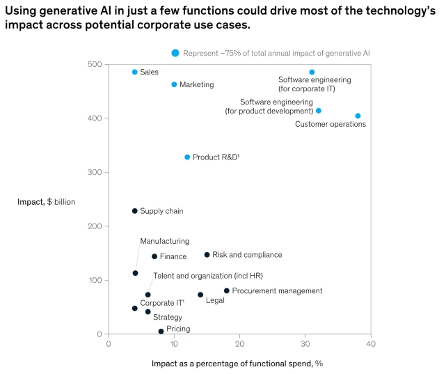 Згідно з прогнозами McKinsey, генеративний ШІ може щорічно приносити світовій економіці від 2,6 до 4,4 трильйона доларів, особливо в таких сферах, як обслуговування клієнтів, маркетинг, розробка програмного забезпечення та наукові дослідження.