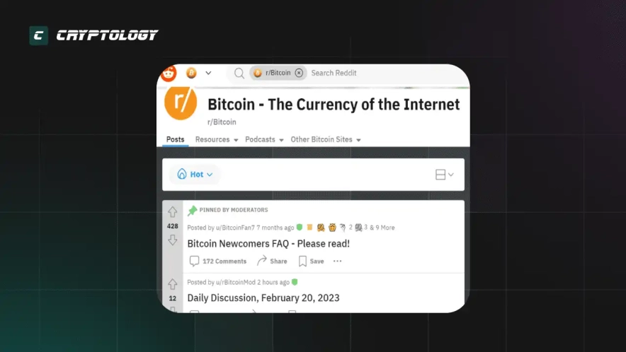 - Субреддит r/Bitcoin на Reddit является одним из крупнейших сообществ о биткоине с 4,8 миллионами подписчиков, а более широкий криптовалютный субреддит r/CryptoCurrency имеет более 6 миллионов подписчиков.