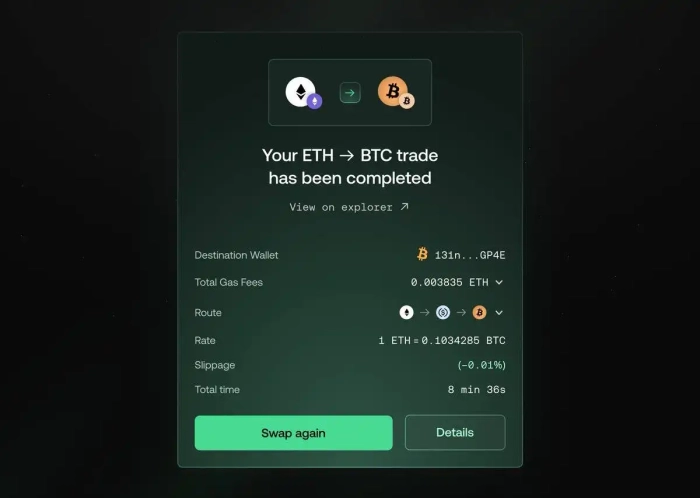 Вы подключаете кошелек и обмениваете BTC на ETH. Система, лежащая в основе протокола выполнит конвертацию. Вы получите ETH за считанные секунды, никаких мостов, регистраций и сложных переводов – все действия выполняются через тот же кошелек, который вы подключили.