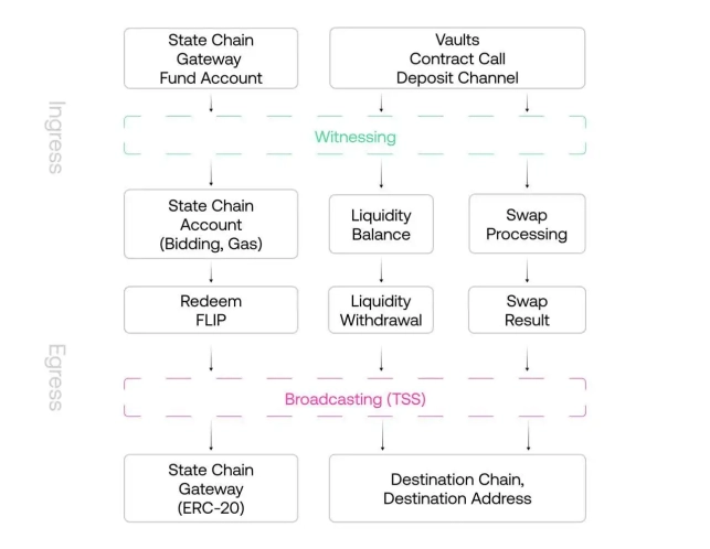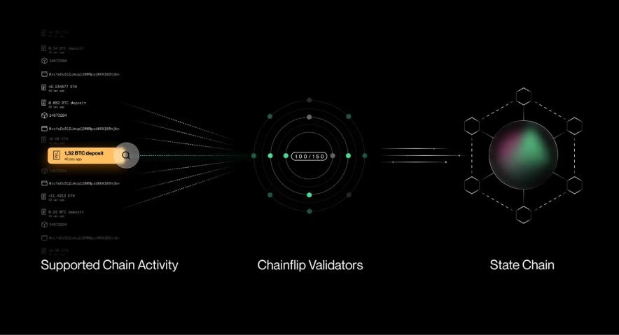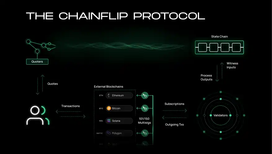 Валидаторы контролируют простые смарт-контракты/кошельки, называемые хранилищами, на нескольких блокчейнах одновременно, создавая полностью децентрализованный «уровень расчетов». Это сочетается с «уровнем учета», который использует специфичную для приложения блокчейн-цепочку на основе Substrate Polkadot, называемая цепочкой состояний Chainflip. Цепочка используется для отслеживания балансов, обработки событий и выполнения инструкций. Эти системы создают полностью децентрализованный общий протокол межсетевого обмена.