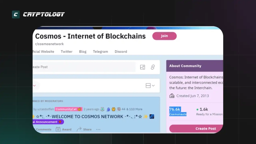 Существует также группа Cosmos Telegram и сообщество Cosmos Reddit с более чем 76 тыс. участников.