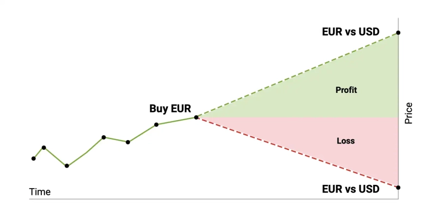 При открытии длинной позиции, вы фактически продаете доллары (валюту котировки), чтобы купить евро (базовую валюту), ожидая продать евро позже по более высокой цене. Ваша прибыль будет равна разнице в цене.