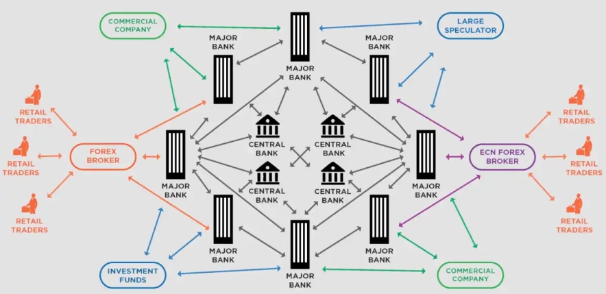 Торговля на рынке Форекс зачастую ведется внебиржевым способом, то есть без физического обмена активами. Вместо того чтобы использовать центральную биржу, такую как Нью-Йоркская фондовая биржа, рынок Форекс управляется и контролируется глобальной сетью банков и финансовых учреждений.