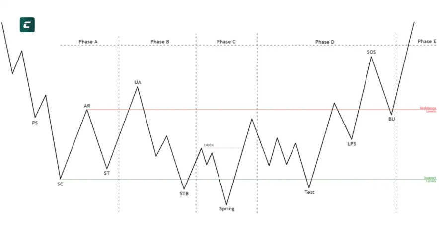 Определение фаз формирования рынка — ключевой момент в методологии Вайкоффа. Эти фазы позволяют трейдерам прогнозировать будущие движения рынка на основе текущего состояния.