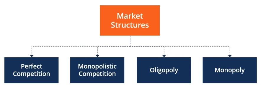 Существует несколько основных типов рыночных структур: совершенная конкуренция, монополия, монополистическая конкуренция и олигополия.