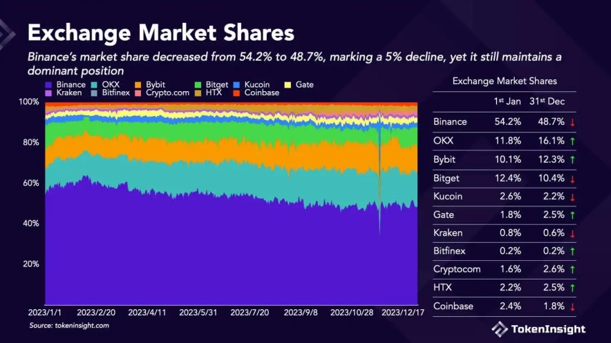 В последние годы Binance, одна из крупнейших централизованных бирж, начала терять свою рыночную долю. Только в 2023 году доля рынка Binance снизилась до 48.7% с 54.2%, которые наблюдались в начале года.