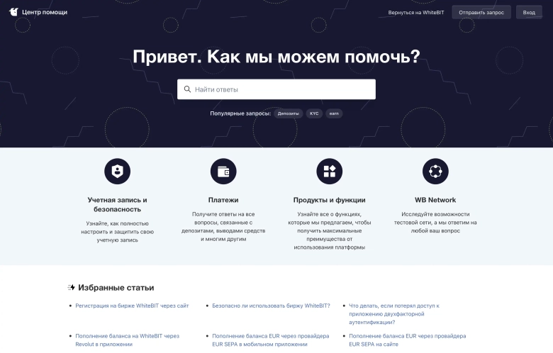 Служба поддержки WhiteBIT работает круглосуточно и без выходных, чтобы помочь пользователям с любыми вопросами или проблемами, которые они могут иметь. Служба поддержки доступна по электронной почте, телефону (причем, пользователи могут звонить как и из Украины, так и из-за ее пределов) и в чате на бирже. Кроме того, на бирже также существует вкладка “Центр помощи”, где каждый пользователь может найти ответы на наиболее распространенные вопросы без общения с кем-либо.