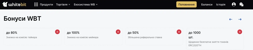 - Скидка на комиссии. Пользователи, которые используют WBT для оплаты комиссий, получают скидку до 100%.
