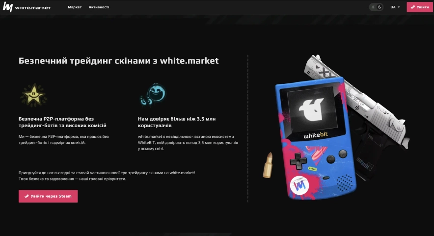 - White.Market – это P2P-платформа для торговли скинами CS:GO. Продавая здесь скины, пользователи могут менять свою криптовалюту на фиат. Безопасность торговли на платформе обеспечивается круглосуточным мониторингом. Кроме того, скины пользователей, разместивших их на платформе, не замораживаются, то есть юезр может использовать их вплоть до продажи покупателю. Кроме того, комиссии на white.market ниже рыночных, а процесс внесения депозита и вывода средств позволяет использовать как банковские карты, так и криптовалютные кошельки.