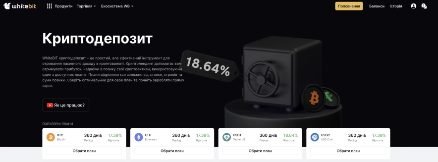 Финансовые продукты, предоставляемые биржами, нацелены на то, чтобы дать возможность юзерам зарабатывать, не занимаясь трейдингом криптовалют. На бирже WhiteBIT для этого созданы “Криптодепозиты”.