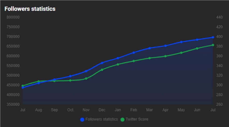Только за 2023 год работа маркетологов помогла завлечь 500к новых подписчиков. 385 баллов по Twitter Score – внушительный показатель – говорит об органическом привлечении внимания и кропотливой работе над выстраиванием связей.