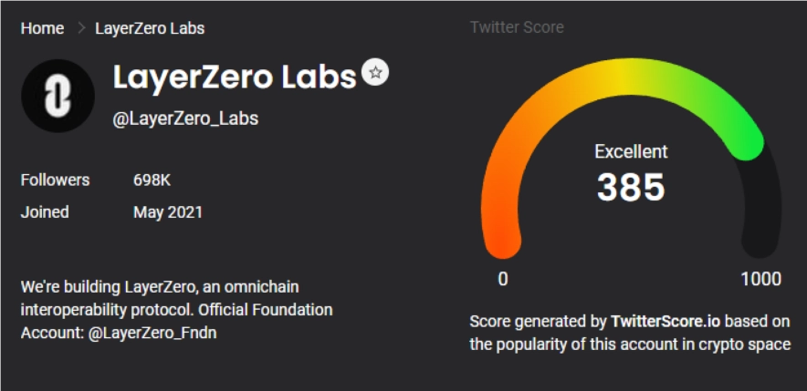 По Twitter Score у аккаунта LayerZero 385 поинтов: 42 подписчика из Тир-1 VC, 23 подписчика из Тир-2 VC, 76 ключевых подписчика из экосистем Aptos, Solana, Ethereum и Cosmos. Аккаунт популярен среди NFT энтузиастов – 223 подписчика из разряда влиятельных фигур в NFT и 20 – от крупных NFT проектов.