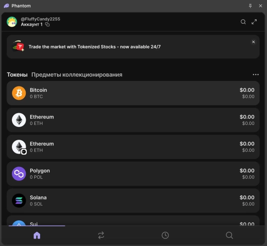 После этого Phantom откроется в полноценном интерфейсе: здесь можно хранить токены Solana и другие активы экосистемы, подключаться к DeFi-сервисам, работать с NFT или отправлять и получать монеты в пару кликов.