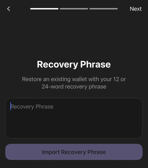 При первом запуске приложение предложит два варианта: создать новый кошелек или восстановить уже существующий с помощью сид-фразы.