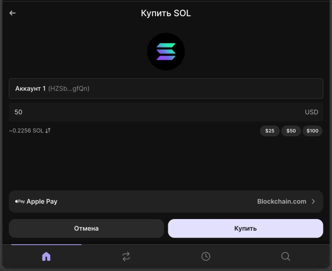 Другой вариант пополнения – покупка криптовалюты прямо внутри кошелька. Phantom поддерживает интеграцию с платежными сервисами, которые позволяют купить SOL или другие токены за банковскую карту. Этот способ удобен для новичков, так как отпадает необходимость сначала заводить аккаунт на бирже, но комиссии здесь могут быть выше. Кроме того, если вы захотите воспользоваться украинской банковской картой, то у вас не получится это сделать, так как подобные операции запрещены на данный момент в нашей стране.
