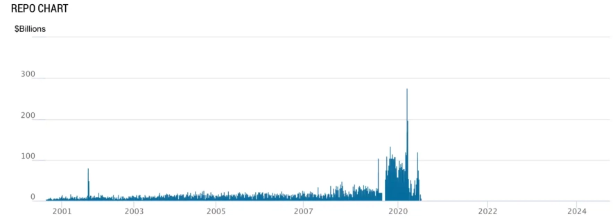 Например, во время ковидного кризиса ФРС активно использовала операции репо для насыщения банковской системы ликвидностью. Пик таких операций пришелся на март 2020 года.